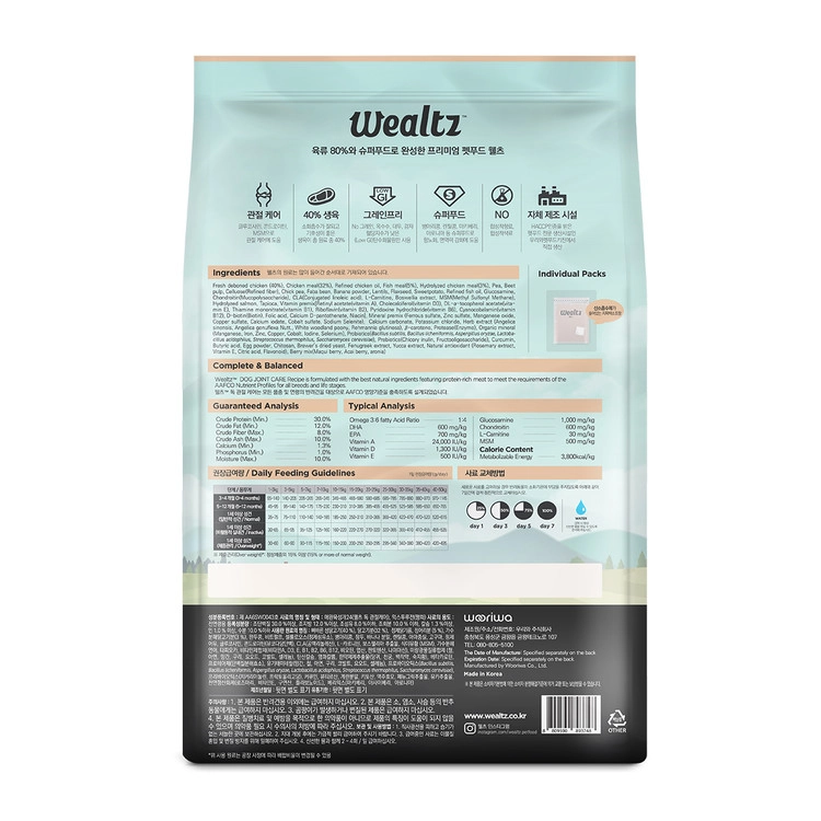 Fresh deboned chicken (40%), Chicken meal(32%), Refined chicken oil, Fish meal(5%), Hydrolyzed chicken meal(3%), Pea, Beet pulp, Celluose(Refined fiber), Chick pea, Faba bean, Banana powder, Lentils, Flaxseed, Sweetpotato, Refined fish oil, Glucosamine, Chondroitin(Mucopolysaccharide), CLA(Conjugated linoleic acid), L-Carnitine, Boswellia extract, MSM(Methyl Sulfonyl Methane), Hydrolyzed salmon, Tapioca, Vitamin premix[Retinyl acetate(vitamin A), Cholecalciferol(vitamin D3), DL-α-tocopherol acetate(vitamin E), Thiamine mononitrate(vitamin B1), Riboflavin(vitamin B2), Pyridoxine hydrochloride(vitamin B6), Cyanocobalamin(vitamin B12), D-biotin(Biotin), Folic acid, Calcium D-pantothenate, Niacin], Mineral premix (Ferrous sulfate, Zinc sulfate, Manganese oxide, Copper sulfate, Calcium iodate, Cobalt sulfate, Sodium Selenite), Calcium carbonate, Potassium chloride, Herb extract (Angelica sinensis, Angelica genuflexa Nutt., White woodland peony, Rehmannia glutinosa), β-carotene, Protease (Enzyme), Organic mineral (Manganese, Iron, Zinc, Copper, Cobalt, Iodine, Selenium), Probiotics (Bacillus subtilis, Bacillus licheniformis, Aspergillus oryzae, Lactobacillus Acidophilus, Streptococcus thermophilus, Saccharomyces cerevisiae), Prebiotics (Chicory inulin, Fructooligosaccharide), Curcumin, Butyric acid, Egg powder, Chitosan, Brewer’s dried yeast, Fenugreek extract, Yucca extract, Natural antioxidant (Rosemary extract, Vitamin E, Citric acid, Flavonoid), Berry mix (Maqui Berry, Acai berry, Aronia)